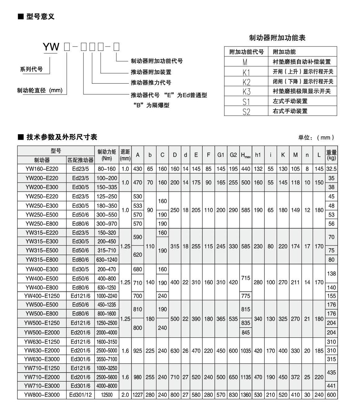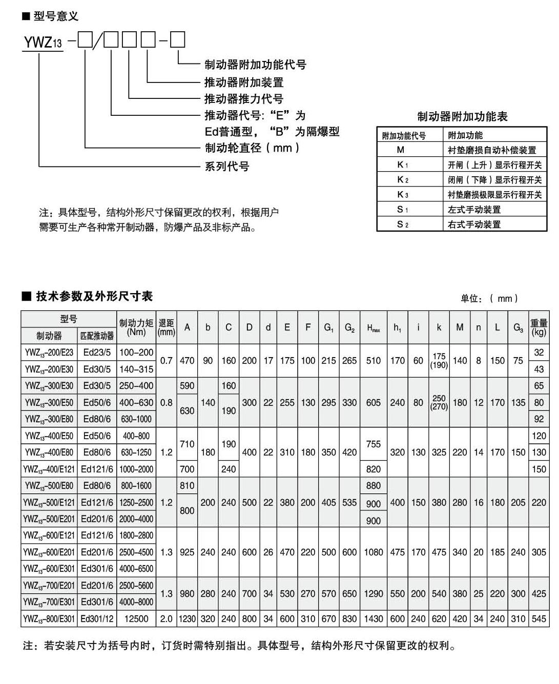 應(yīng)用:YW,YWZ13系列電力液壓鼓式制動器,廣泛應(yīng)用于有防爆要求的各種起重運輸、皮帶運輸、港口裝卸、冶金及建筑機(jī)械中各種機(jī)構(gòu)的減速和停車(維持)制動。符合標(biāo)準(zhǔn):YW,YWZ13系列電力液壓鼓式制動器的連接尺寸和技術(shù)要求符合JB / T6406-2006標(biāo)準(zhǔn);制動力矩參數(shù)符合DIN15435標(biāo)準(zhǔn),配套符合DIN15430標(biāo)準(zhǔn)的Ed系列推動器。主要特點:▲ 聯(lián)鎖式退距均等裝置和瓦塊自動隨位裝置,可始終保持兩側(cè)瓦塊退距均等且無需調(diào)整,完全避免因退距不均使一側(cè)制動襯墊浮貼制動輪的現(xiàn)