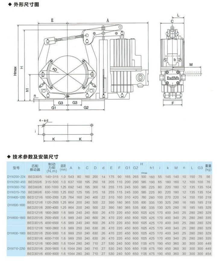應(yīng)用:DYW,BYWZ5系列電力液壓塊式制動器是一種臥式安裝(相對于制動輪軸線為水平安裝)的制動器,主要用于門座式起重機和塔式起重機等回轉(zhuǎn)機構(gòu)的減速制動。符合標(biāo)準(zhǔn):DYW,BYWZ5系列制動器連接尺寸和技術(shù)要求符合JB/T6406-2006標(biāo)準(zhǔn),制動力矩參數(shù)符合DIN15435標(biāo)準(zhǔn)。DYWZ5系列制動器連接尺寸和制動力矩參數(shù)符合GB6333-86標(biāo)準(zhǔn),技術(shù)要求符合JB/T6406-2006標(biāo)準(zhǔn)。DYW和DYWZ5系列鼓式制動器配套符合GB3836.2的Ed系列隔爆型推動器。本