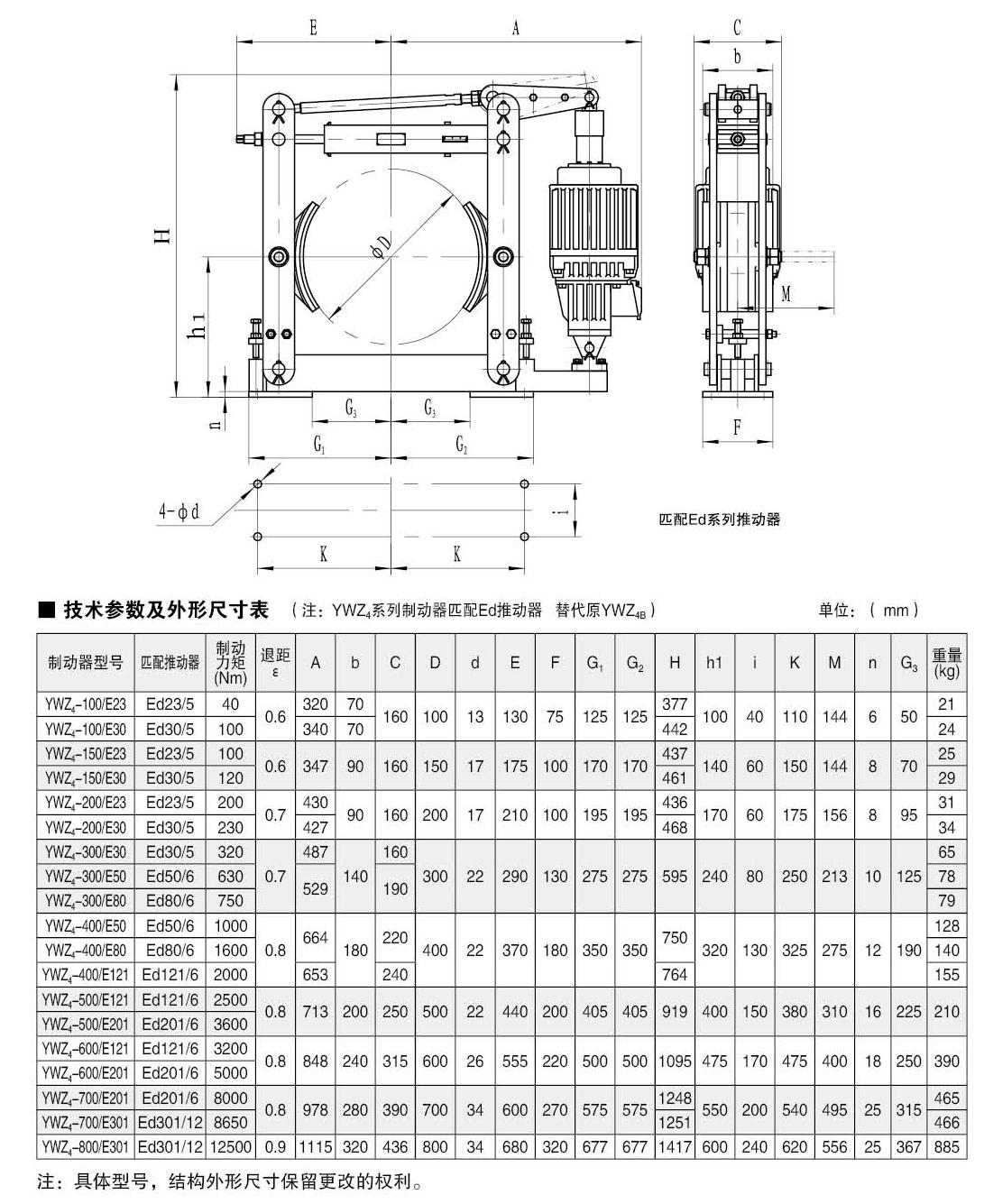 應用:YWZ4(YT1)系列電力液壓鼓式制動器,廣泛應用于有防爆要求的各種起重運輸、皮帶運輸、港口裝卸、冶金及建筑機械中各種機構的減速和停車(維持)制動。YWZ4(Ed)系列電力液壓鼓式制動器,廣泛應用于有防爆要求的各種起重運輸、皮帶運輸、港口裝卸、冶金及建筑機械中各種機構的減速和停車(維持)制動。符合標準:YWZ(YT1)系列電力液壓鼓式制動器的連接尺寸和制動力矩參數符合JB/ZQ4388-86標準,技術要求符合JB / T6406-2006標準。YWZ4(Ed)系列電力液
