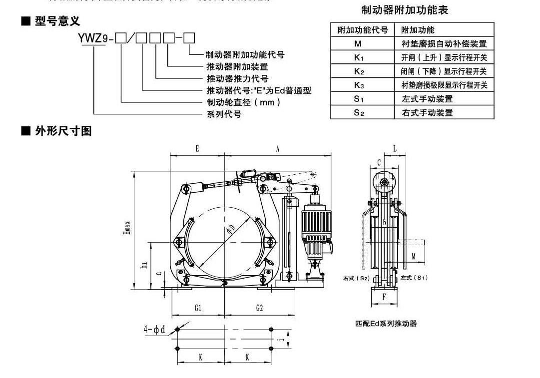 應(yīng)用:YWZ5 YWZ9系列電力液壓鼓式制動(dòng)器,廣泛應(yīng)用于有防爆要求的各種起重運(yùn)輸、皮帶運(yùn)輸、港口裝卸、冶金及建筑機(jī)械中各種機(jī)構(gòu)的減速和停車(chē)(維持)制動(dòng)。符合標(biāo)準(zhǔn):YWZ5系列電力液壓鼓式制動(dòng)器的連接尺寸和制動(dòng)力矩參數(shù)符合GB6333-86標(biāo)準(zhǔn),技術(shù)要求符合JB / T6406-2006標(biāo)準(zhǔn),配套符合DIN15430標(biāo)準(zhǔn)的Ed系列推動(dòng)器。主要特點(diǎn):▲ 聯(lián)鎖式退距均等裝置和瓦塊自動(dòng)隨位裝置,可始終保持兩側(cè)瓦塊退距均等且無(wú)需調(diào)整,完全避免因退距不均使一側(cè)制動(dòng)襯墊浮貼制